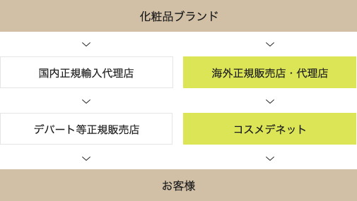 販売店がブランドと正規代理店契約をしていないことを並行輸入といいます。コスメデネットでは、正規代理店契約は行わず、ヨーロッパやアメリカ、アジア各地の正規取引業者を通じて仕入れを行っております。