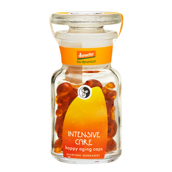 40歳以上の成熟肌向けのスペシャルカプセル、ハッピーエイジ カプセル インテンシブケア。ローズヒップオイル、ブラッククミンオイル、アーモンドオイル、グレープシードオイルなどをフレッシュな状態でカプセルに閉じ込めました。